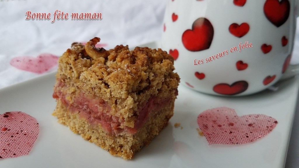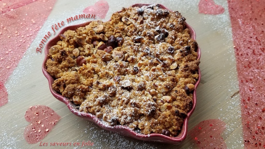 Pour faire honneur à ma maman que j’aime de tout mon cœur, je souhaite la chouchouter avec ce crumble cœur (en forme de cœur) qui cache un cœur de compote fraise rhubarbe…un petit jeu de mot…pour lui dire « Je t’aime de tout mon cœur ».
