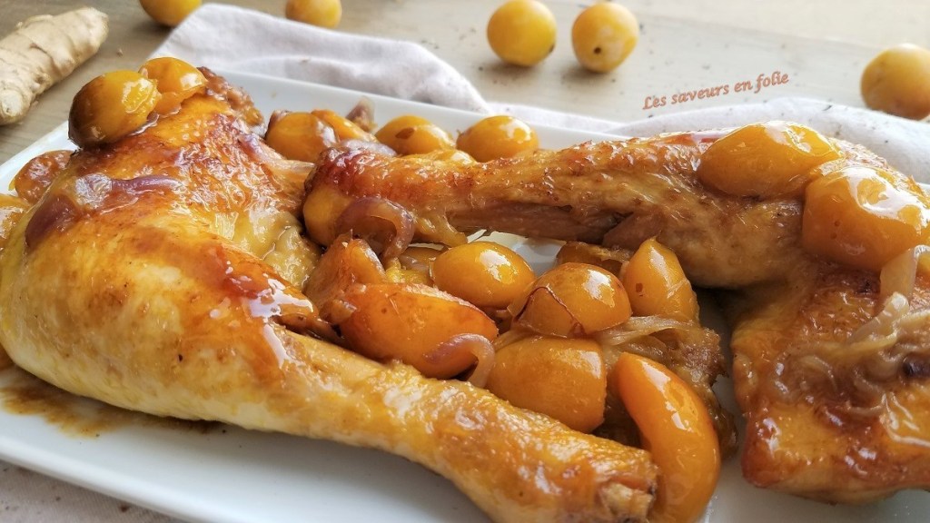 Merci à Michelle d’avoir partagé cette recette que je vous donne à mon tour. Qu’est ce que ça sentait bon dans la cuisine !!! Et une explosion en bouche avec le safran qui ressort et le côté sucré de la mirabelle et de l’oignon qui a mijoté à côté du poulet mariné au gingembre. Hummm j’en salive encore. Place à la recette…