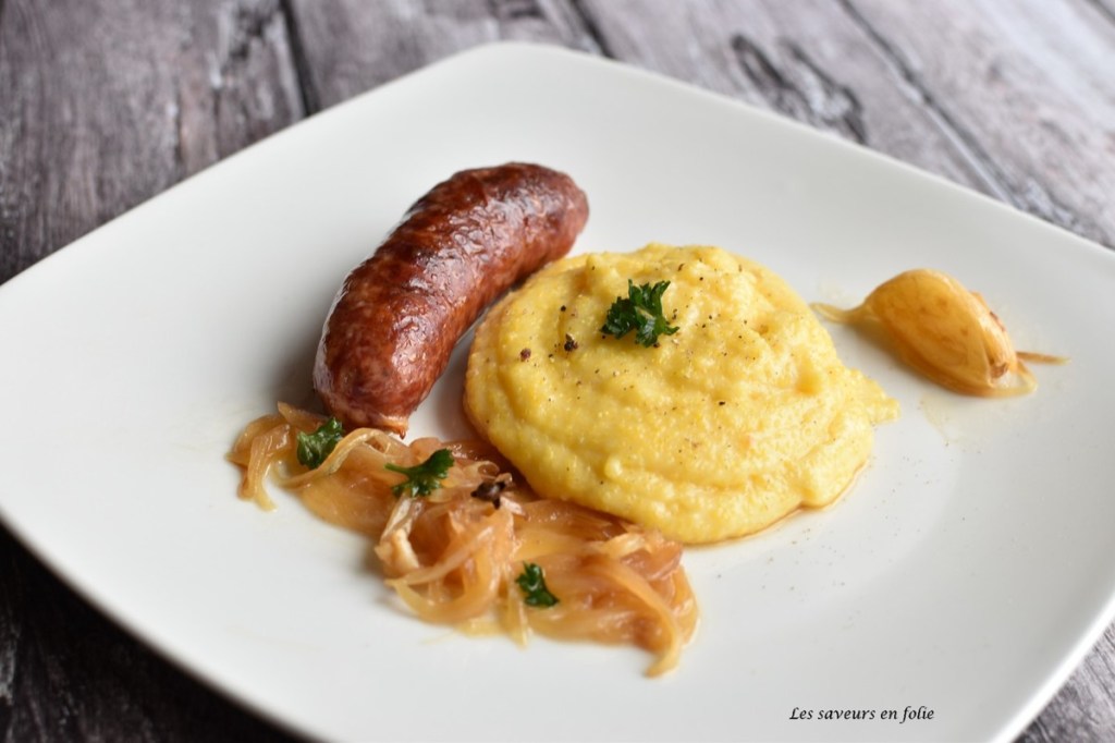 Quoi de mieux qu’une bonne Polenta fondante à la tomme de Savoie avec des diots au vin blanc moelleux et juteux…oui je sais il ne manque que la chaleur de la cheminée, la neige à travers la fenêtre et on y est presque !!!