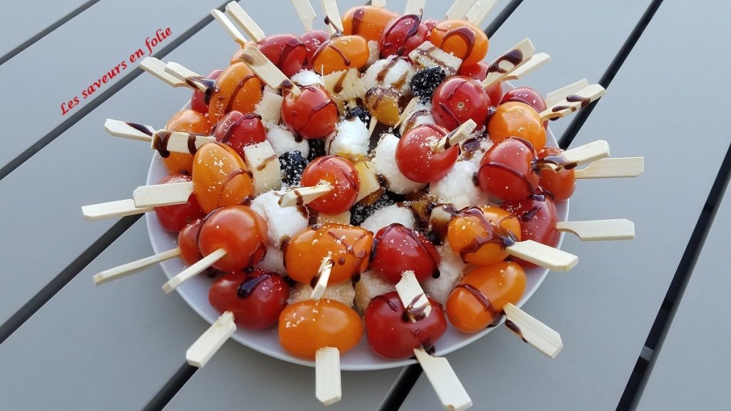 C’est un jeu d’enfant…prenez une mini brochette et alterner tomate cerise, mozza, olives noire puis sur une autre tomate cerise, tomme, abricot sec…toutes les combinaisons sont possibles.