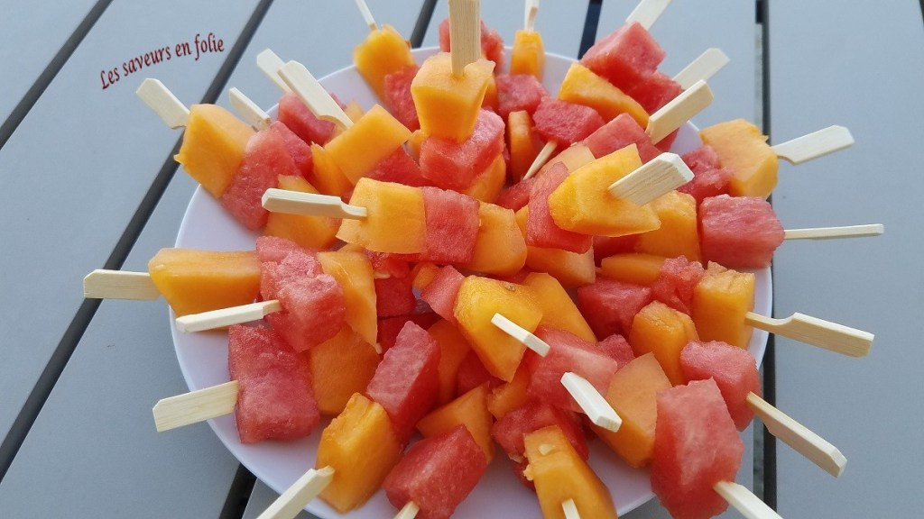 Pour les mini brochettes sucrées c’est pareil. Découper le melon et la pastèque en dés et alterner les morceaux sur les mini brochettes. Servir très frais.