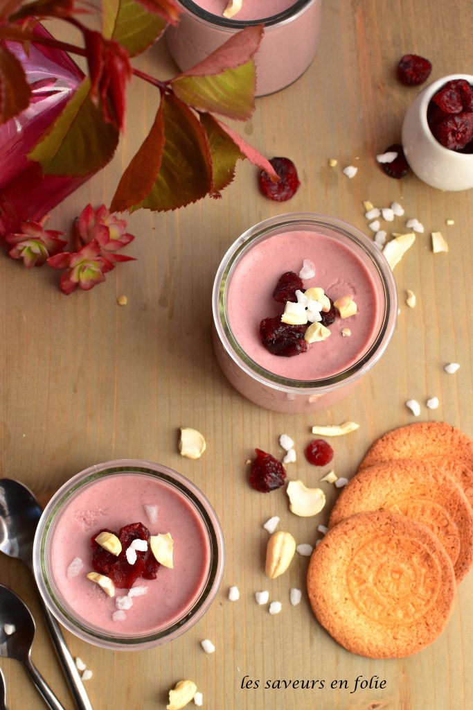 Pour le topping je n’avais pas de framboises (beh oui ce n’est pas la saison!) donc j’ai agrémenté avec des cranberries, du sucre perlé et des noix de cajou. Mais je pense qu’avec 2 ou 3 framboises fraîches cela aurait été le top. Recette à refaire lorsque ça sera la saison des framboises.