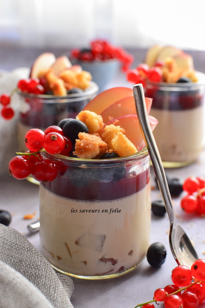 De la douceur avec la panna cotta, le sucré des fruits et le croquant du crumble…tout y est pour un dessert ultra gourmand et ultra frais !!!!
