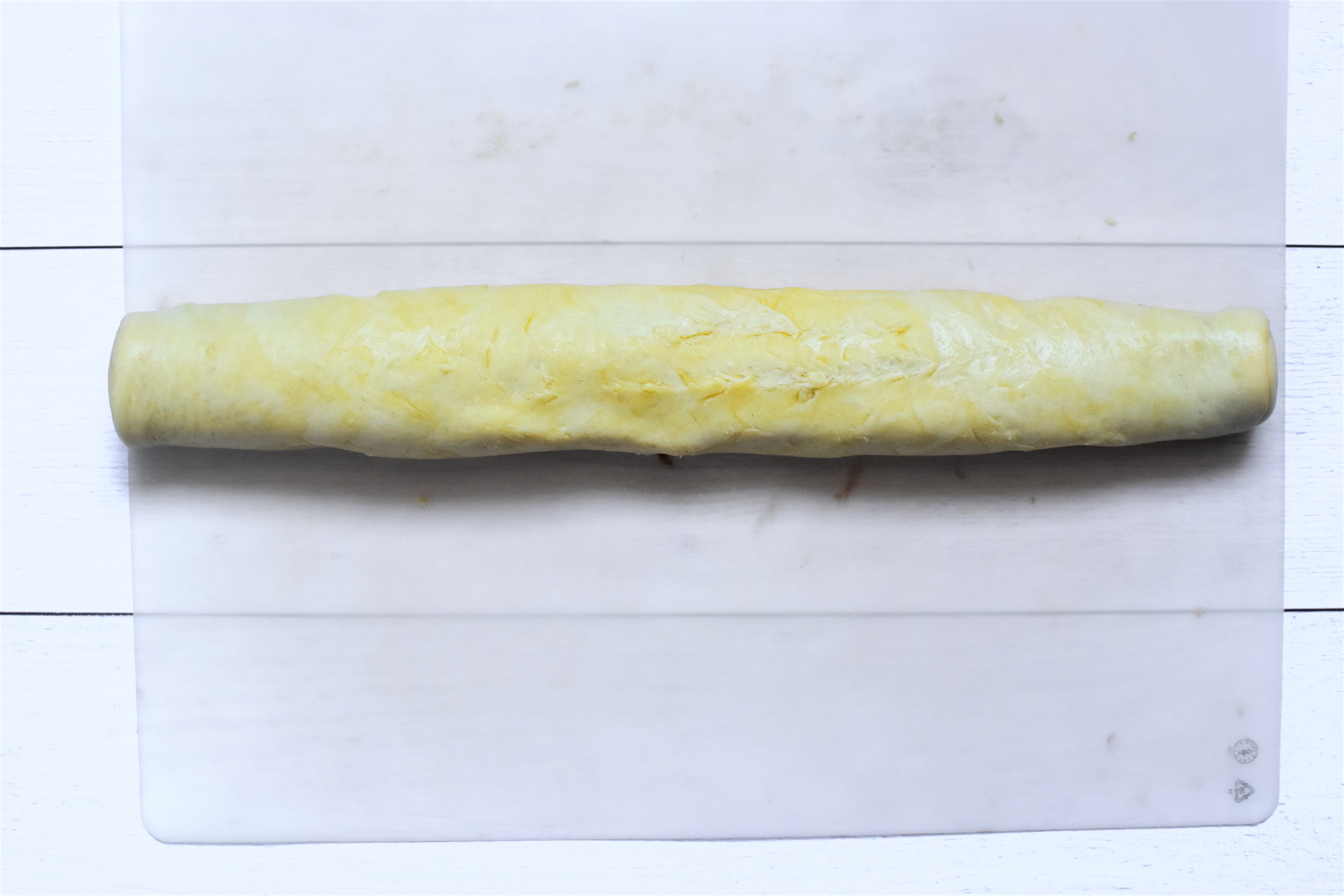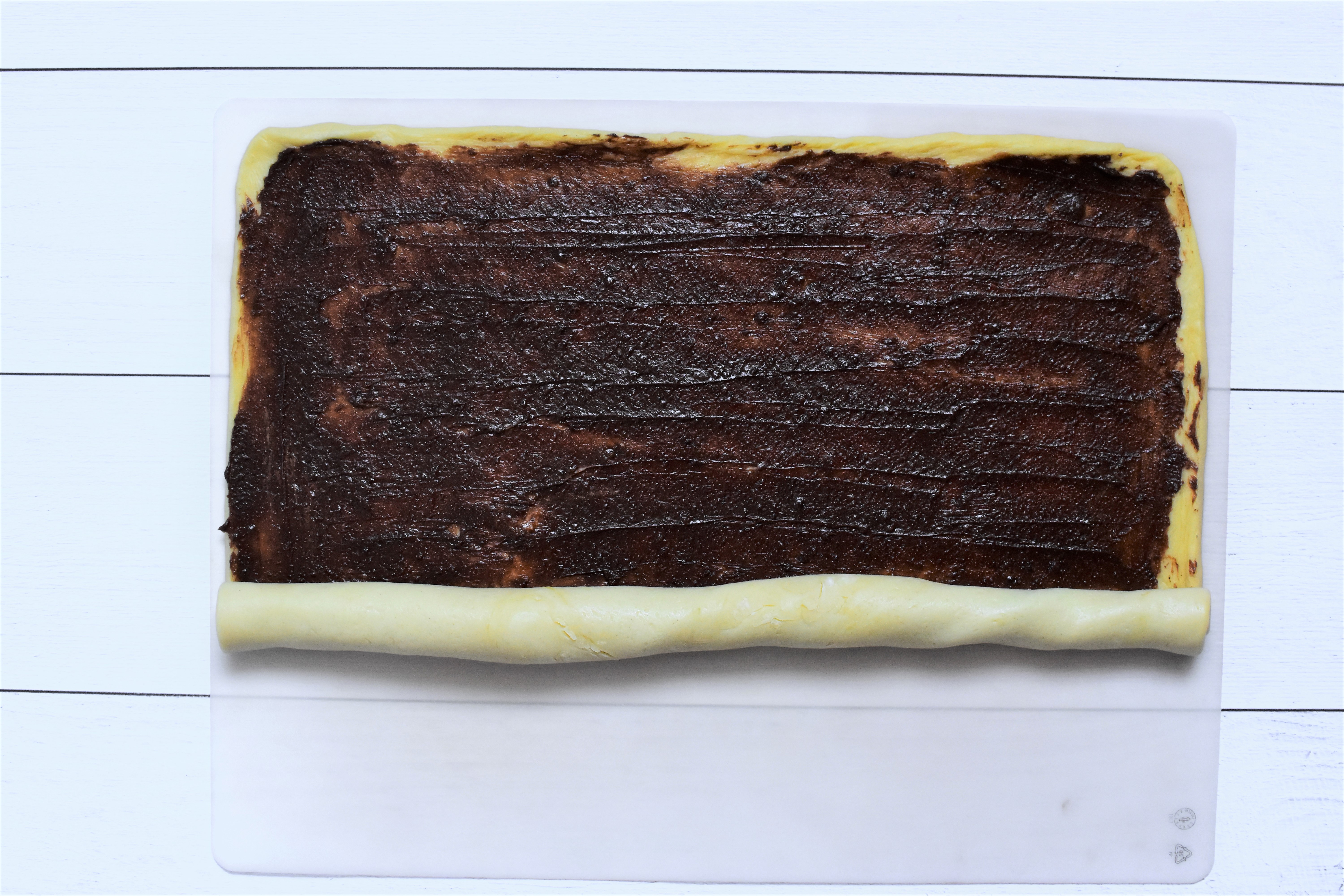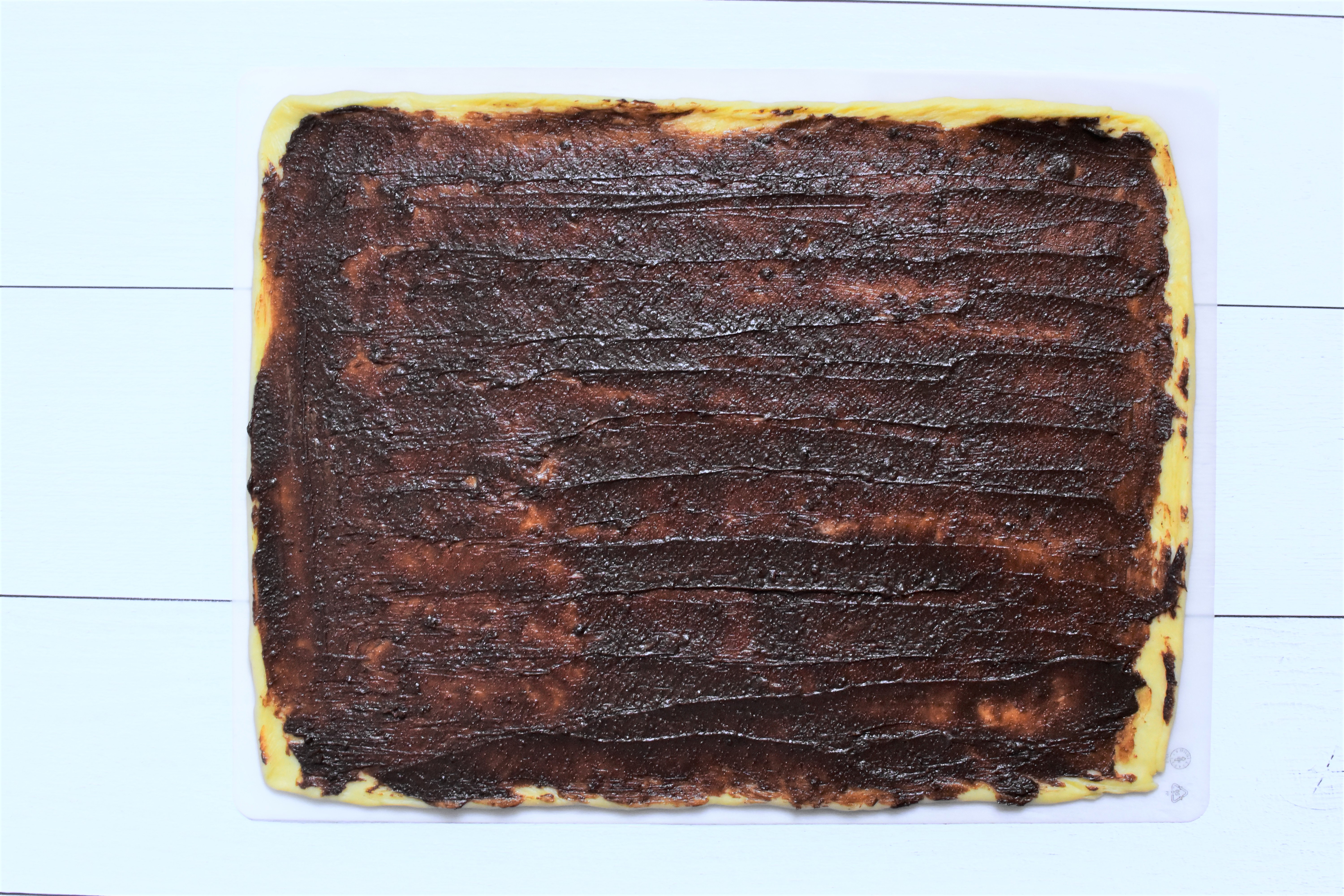 - Etaler la garniture dessus et rouler la pâte dans le sens de la largeur.