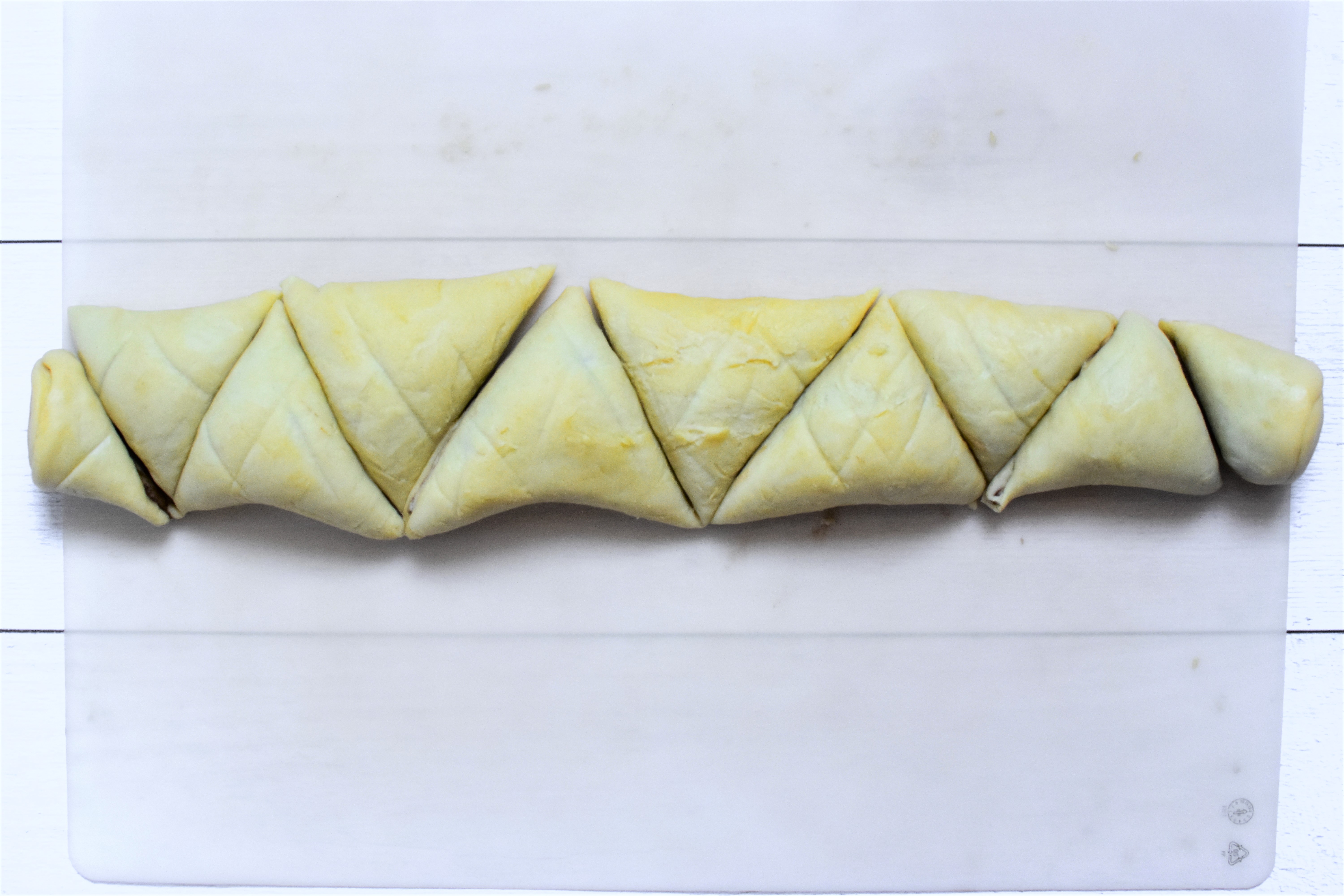 - Mettre les triangles sur leur base avec la pointe vers le haut et à l’aide d’une baguette ou pique à brochette aplatir la pointe du triangle jusqu’à la base (voir la technique en photos)