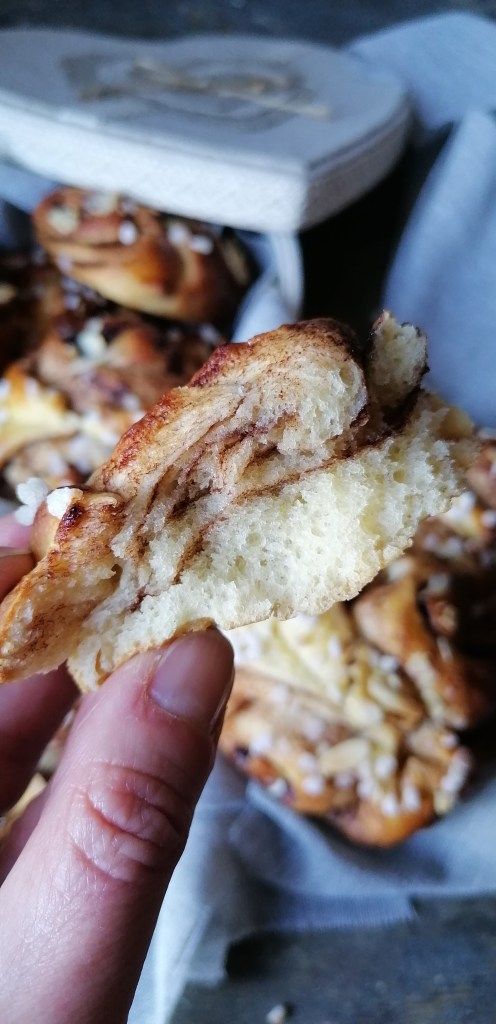 Je cherchais une spécialité étrangère de brioche que j’ai trouvé sur le blog de Sandra Le pétrin. Ce sont des petites brioches finlandaises en forme d’oreilles, parfumées à la cannelle et cardamone saupoudrées de grain de sucre. J’ai longtemps hésité avant de revisiter la recette. Je m’en excuse par avance pour les puristes des recettes traditionnelles mais j’avoue que la cardamone ne m’enchante pas trop. J’ai pensé la remplacer par l’anis étoilé mais je me suis dit qu’avec la cannelle cela risquait de ne pas faire bon ménage. J’ai conservé la cannelle et j’ai revisité la garniture pour l’adapter à mon goût et celui des enfants.
