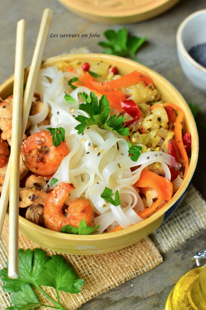 Dans cette recette je suis partie sur des nouilles de riz ( à base de farine de riz) c’est parfaits pour les estomacs fragiles comme moi ou les intolérants au gluten. Leur couleur blanche donne de la luminosité dans l’assiette. Je l’ai accompagné de légumes que j’apprécie beaucoup, le chou chinois , la carotte et les poivrons. Et du poulet et des crevettes pour les protéines. Le tout bien assaisonné…je vous laisse découvrir tout cela dans la recette.