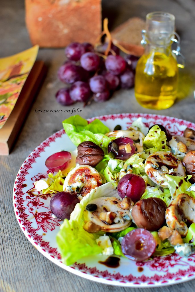 Eté comme hiver, mélange de sucré salé, avoir une assiette appétissante et coloré. Quoi de mieux que des produits de saison : châtaigne, raisin rose, boudin blanc qui annonce les fêtes de fin d’année.